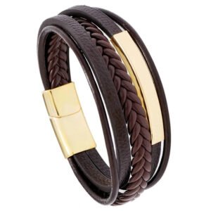 Βραχιόλι αντρικό χρυσό ατσάλι με καφέ λουριά-BR177